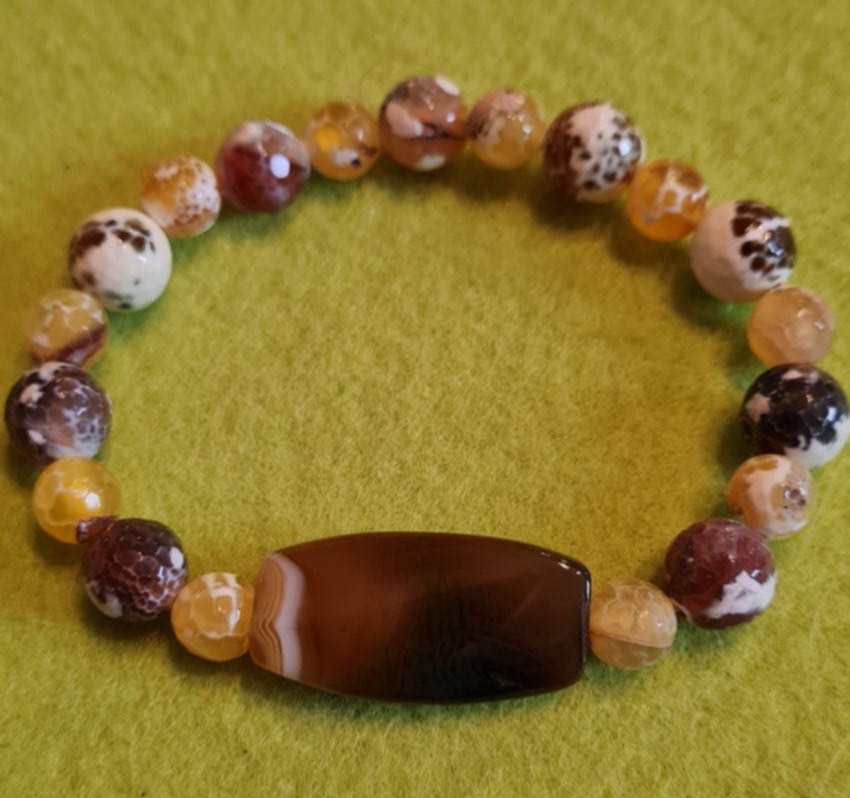 Naturaalsest lihvitud poolvääriskivist (kollasepruunikirju draakon-ahhaat, kollase-pruunikirju ahhaat) veniv käevõru.