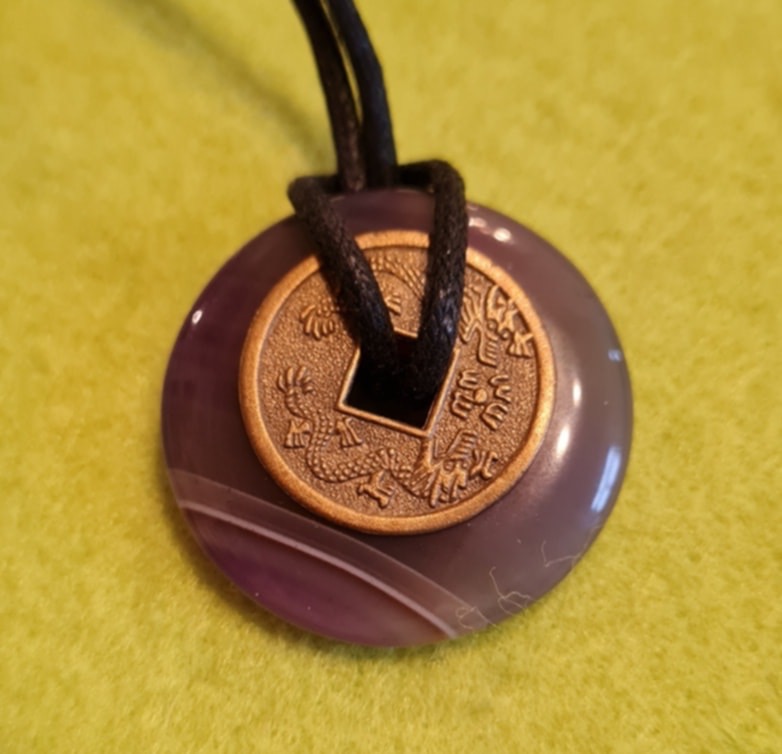 Kaunis naturaalsest poolvääriskivist ahhaat ripats – taevaketas, kõrgus ca 3 cm + Hiina õnnemünt