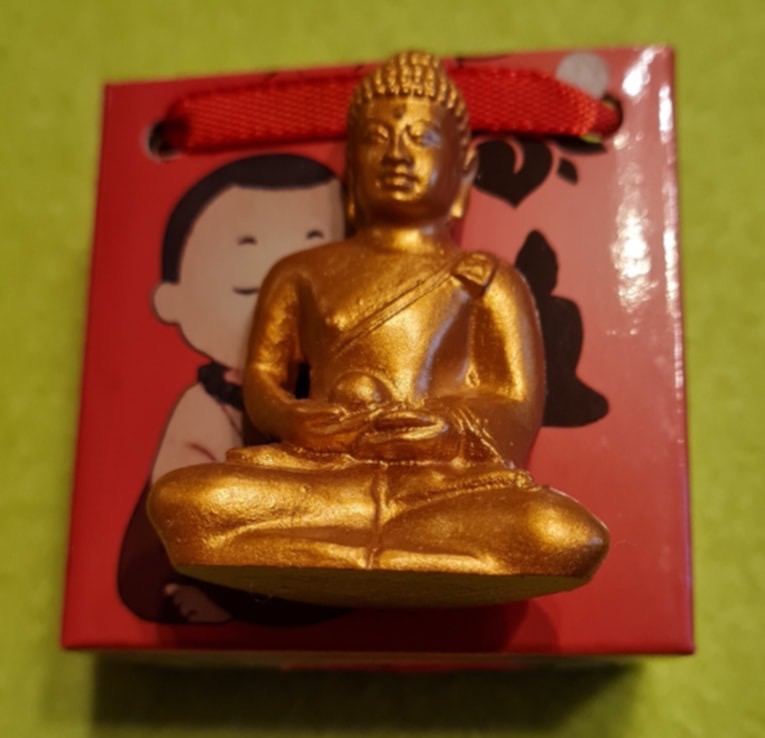 Mediteeriv kuldne Buddha kinkekotis. Mõõdud ca – 5×3,5 cm.