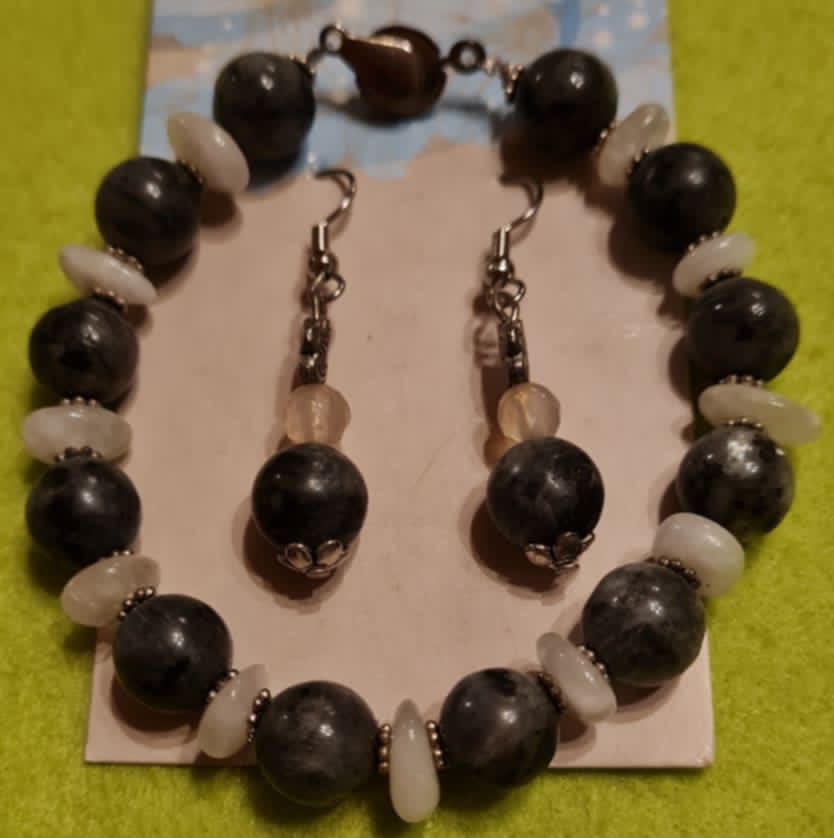 Pakkuda väga kaunis komplekt norra kuukivist (larvikiit) ja kuukivist – kõrvarõngad ja käevõru.