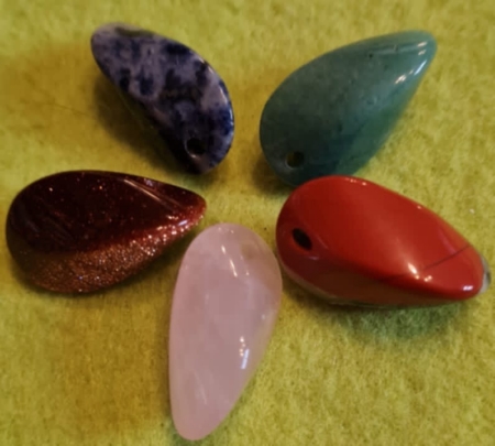 Kasutatud kivimid – roosa kvarts, sodaliit, roheline aventuriin, punane jaspis ja punane kuldkivi.