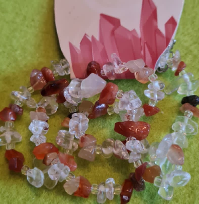 Naturaalsetest poolvääriskivi (karneool ja mäekristall) lihvitud tsipsidest kaelakee, pikkus ca 45 cm.