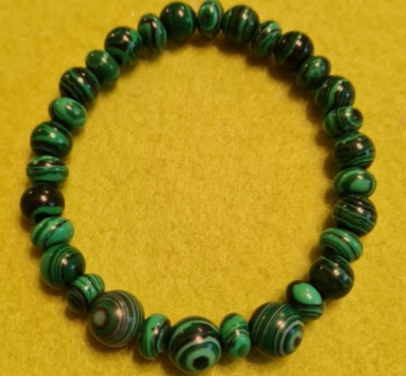 Sünteetiline poolvääriskivi – malahhiit – lihvitud helmestest käevõru.