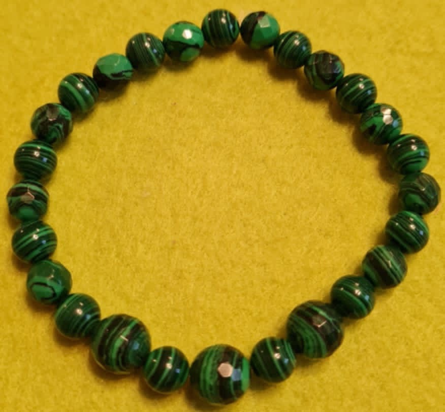 Sünteetiline poolvääriskivi – malahhiit – lihvitud helmestest käevõru.