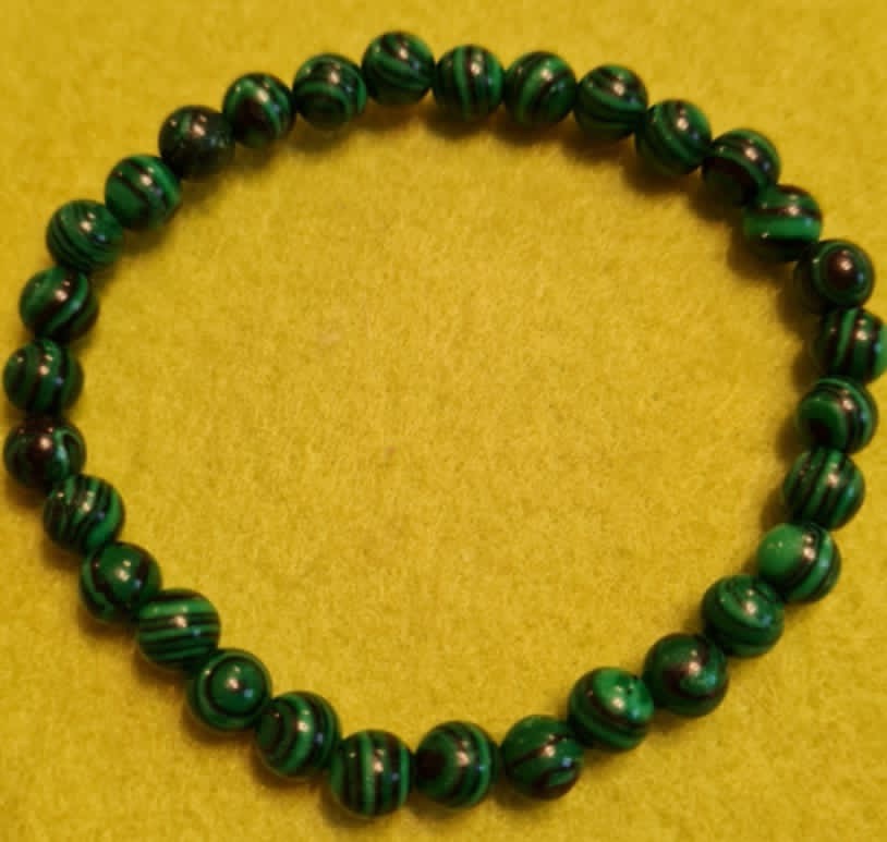 Sünteetiline poolvääriskivi malahhiit – lihvitud helmestest käevõru.