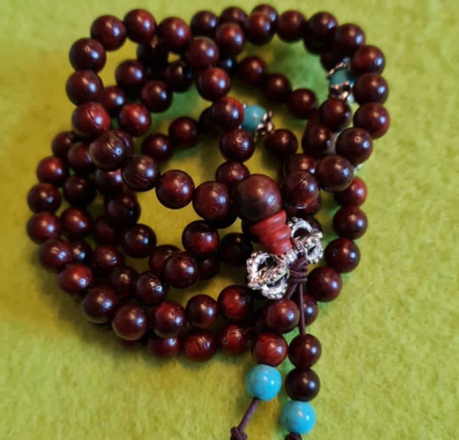 The string of beads is mainly used to count repeated mantras. So actually, it serves the same purpose as a rosary. Beads made of semi-precious stones, pearls, bodhi seeds, bone or wood may serve all kinds of goals, like counting any kind of mantras, or other forms of prayer, bows, walk-rounds and such. The cord is the same for every mala, and should be made of nine threads, symbolising the Buddha Vajradhara and the eight Bodhisattvas. The larger bead at the end stands for wisdom, realising the utter emptiness, and the cylindrical bead on top of the large bead symbolises the void itself. Together, they symbolise the triumph over all adversaries.