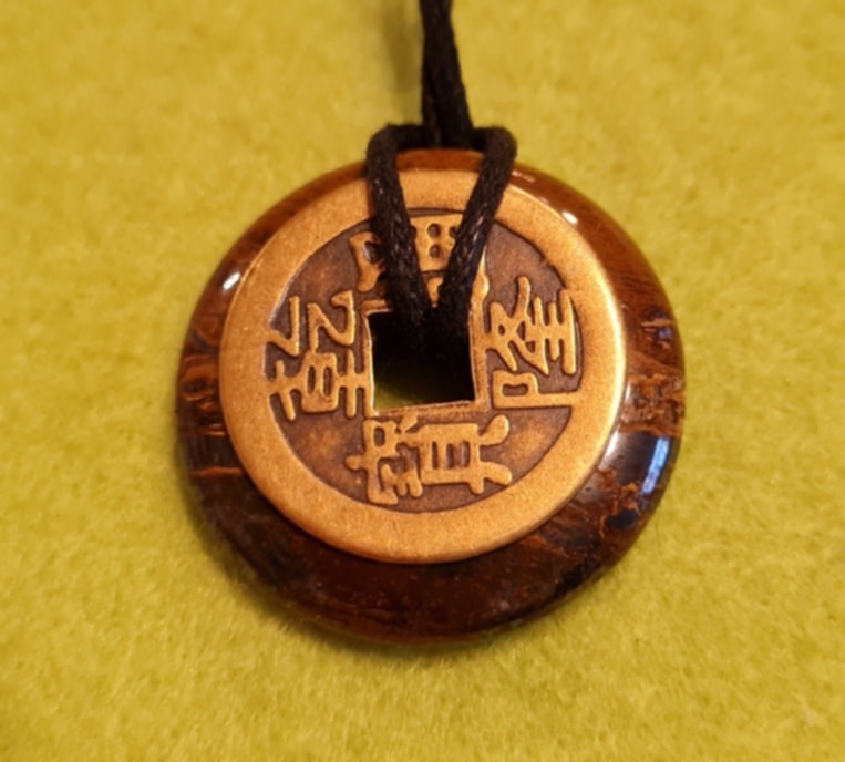 Kaunist naturaalsest poolvääriskivist (tiigriraud) ripats + Hiina õnnemünt